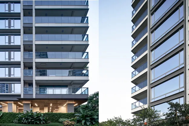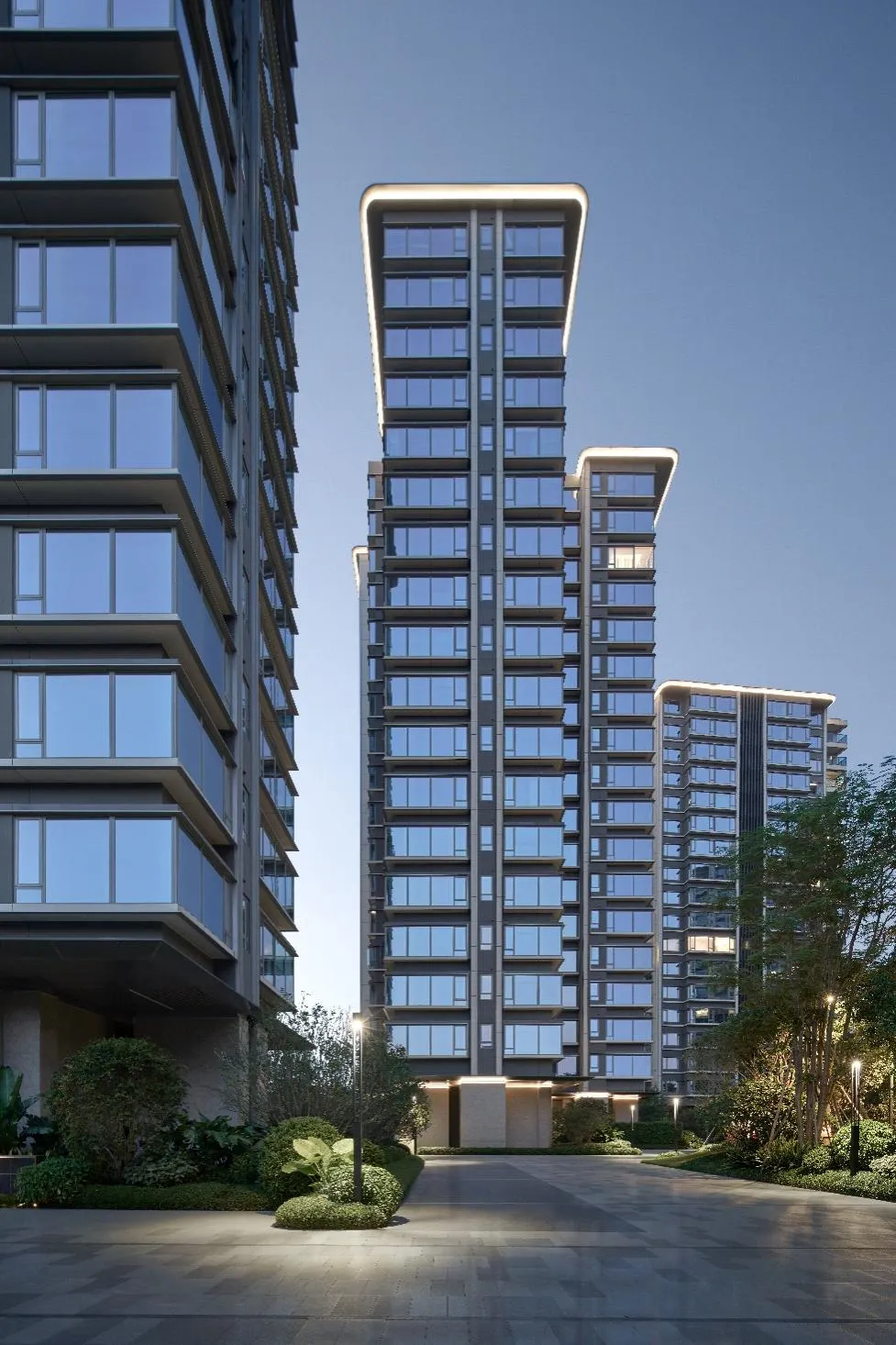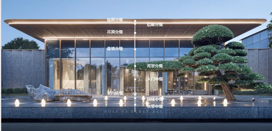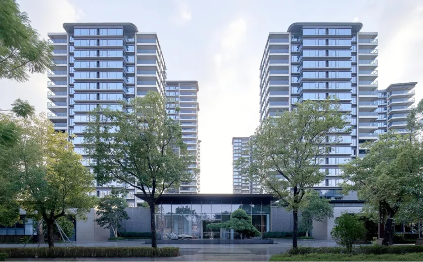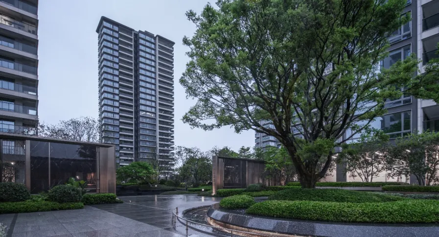 建筑并非孤立的存在,而是作为连接城市生活与自然野趣的媒介。在建筑群落与滨江公园之间,设计师精心塑造了一片自然过渡的场所。结合酒店式环岛落客区,定制化的门楼,6.4米超大雨篷挑檐,展现出恢弘大气的迎宾姿态;7.2米高的超大尺度超白高透玻璃,模糊了室内外的界限,将光影与景色引入,共同以一幅现代画境,营造出静谧、放松的生态归家序章。