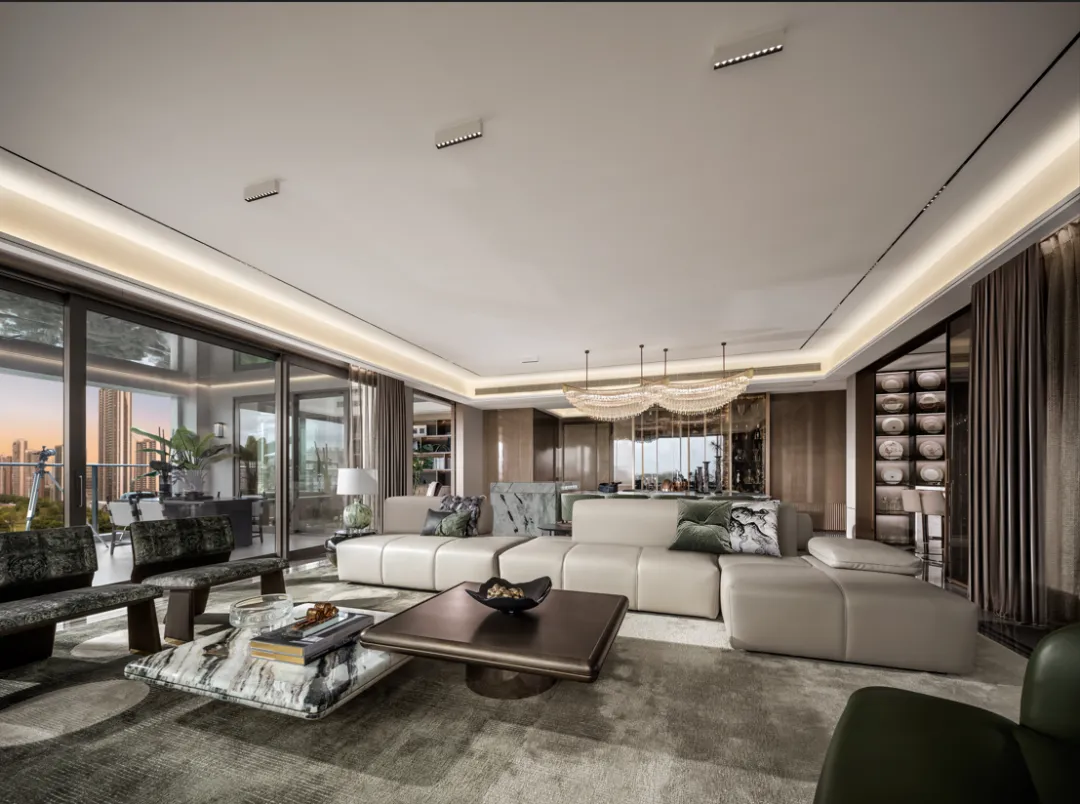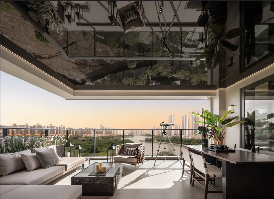 户型设计的核心是“观景”。采用IMAX级巨幅窗概念,最大化开窗面积,确保观景面的极致开阔。窗户的开窗沿边部设置,确保了居中立面视野的绝对纯净与无任何遮挡,将三江六岸的壮丽景色,如同一幅流动的巨幕油画,完整地纳入室内。 “甲板式”阳台——空中的会客厅:创新性地打造了面宽达6.1米、进深4.5米、面积约28㎡的“甲板式”江景阳台。它重新定义了阳台的价值,使其成为家庭生活的延伸与品质生活的秀场。