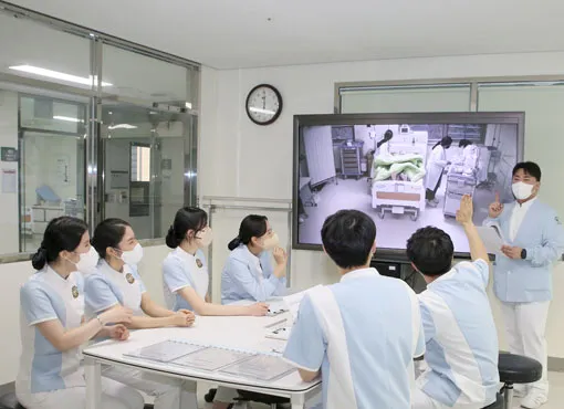 座谈会结束后,庆南大学代表团在我校领导陪同下,参观护理、中医康复实训室。