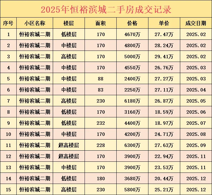 恒裕滨城二期,成交6套,其中5套成交价都是在3500万以上。
