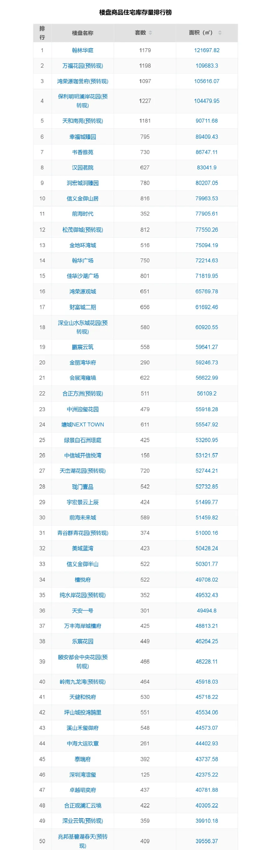 2025年深圳市商品住宅库存前50楼盘大数据