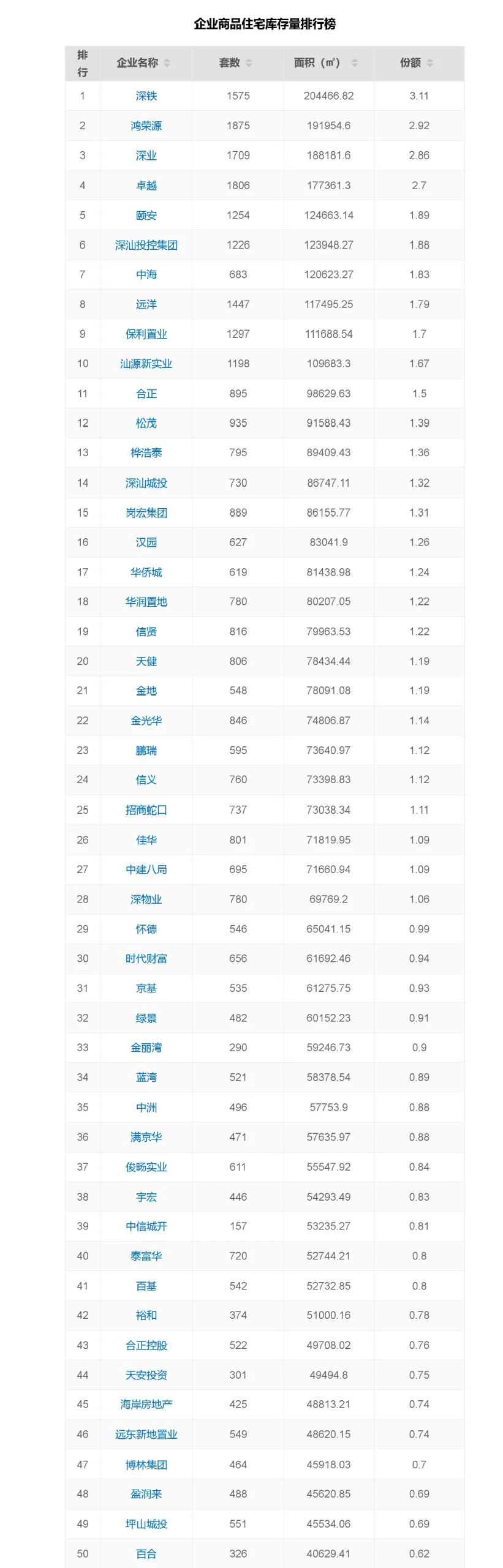 2025年深圳市商品住宅库存前50房企大数据