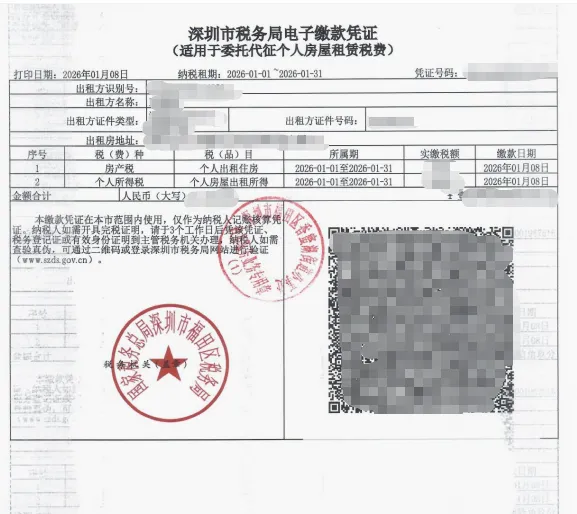 个人所得税 | 约1.07%(地方核定) | 法定税率为20%,深圳实行地方核定征收率约1.07%;计算时可扣除已缴税费、修缮费用(每次限800元)等,进一步降低税负。 |