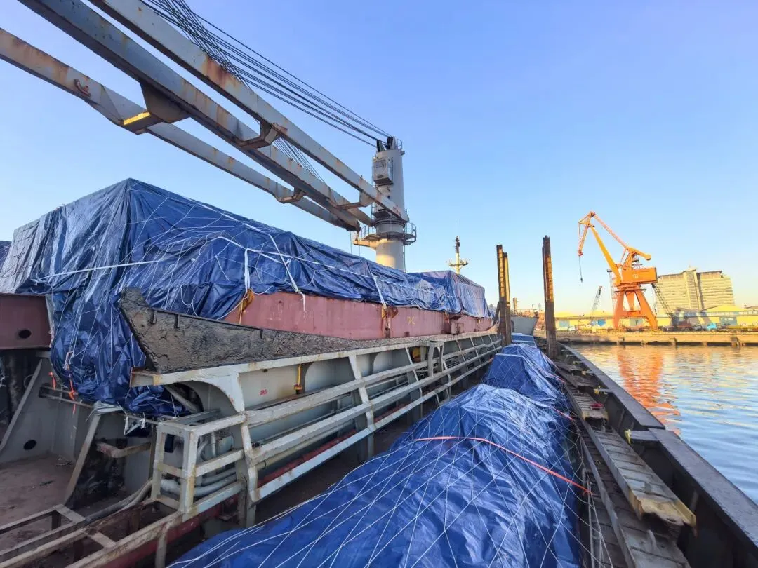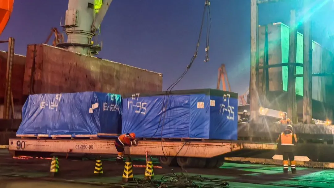 针对超限设备对船舶积载与稳性控制的高要求,以及传统集装箱船无法适配的难题,项目团队综合评估、优化方案,最终定制散货船运输路径,将起运港调整至天津港,使整体物流周期缩短8至10天。