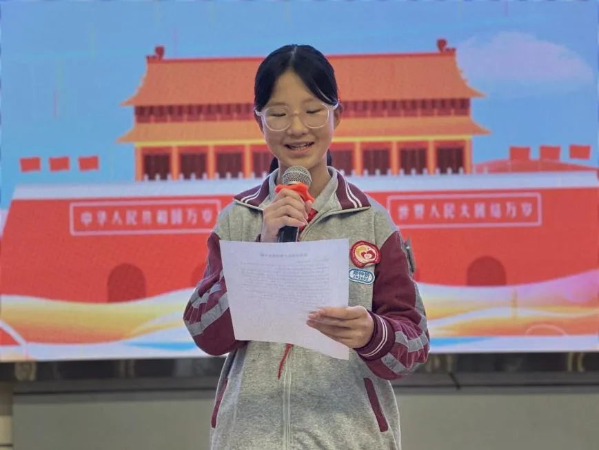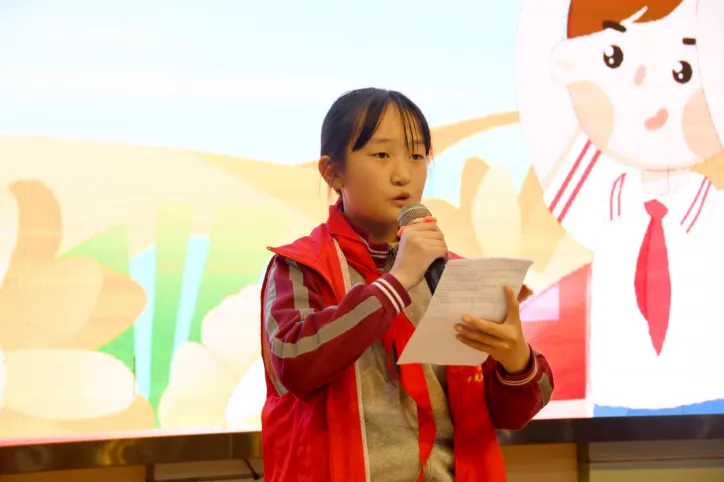 接着,少先队大队长郑钟妍代表全体队干部发言。她回顾了本学期大队部组织的各项少先队活动,这些活动丰富了大家的课余生活,也增强了队员们的爱国情感和集体荣誉感。她表示,今后会和大家一起努力,更好地为学校和同学们服务。