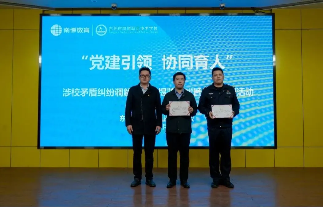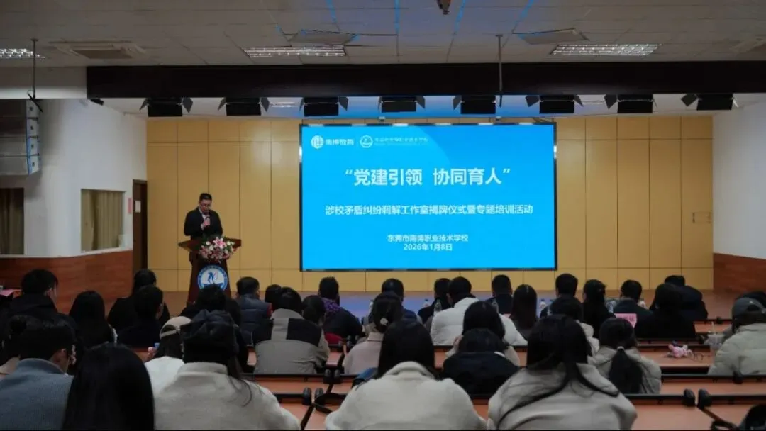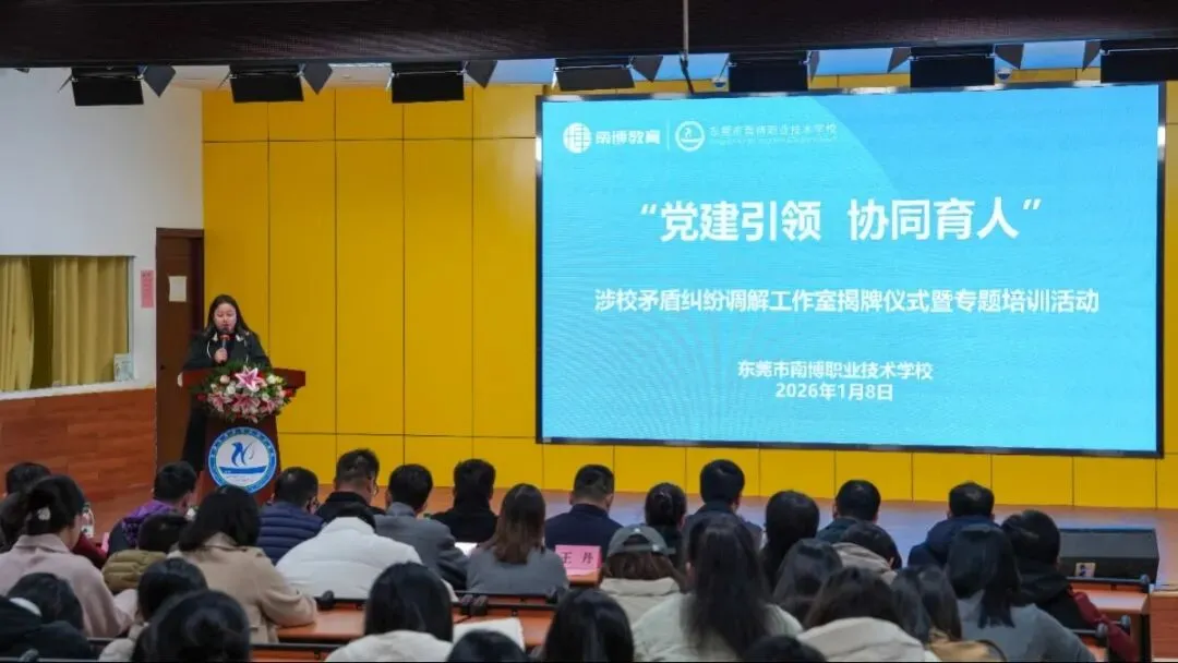为营造平安和谐的校园环境,积极预防和有效化解校园矛盾纠纷,保护学生、学校的合法权益,筑牢协同育人安全防线,1月8日下午,东莞市南博职业技术学校“涉校矛盾纠纷调解工作室”揭牌仪式暨专题培训活动在学校报告厅隆重举行。南城街道教育系统党委委员徐雄杰同志、南博职校法制副校长陈舒亮同志、南博职校法律顾问梁国恩同志等出席了活动。我校全体教职工、学生家长代表参加了本次活动,学校团委书记李文文主持会议。