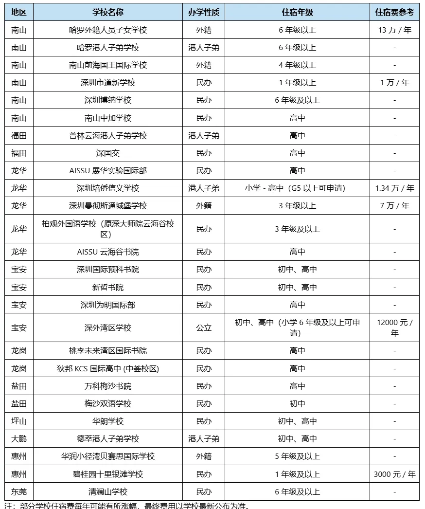 深圳及周边国际学校住宿费盘点(部分)