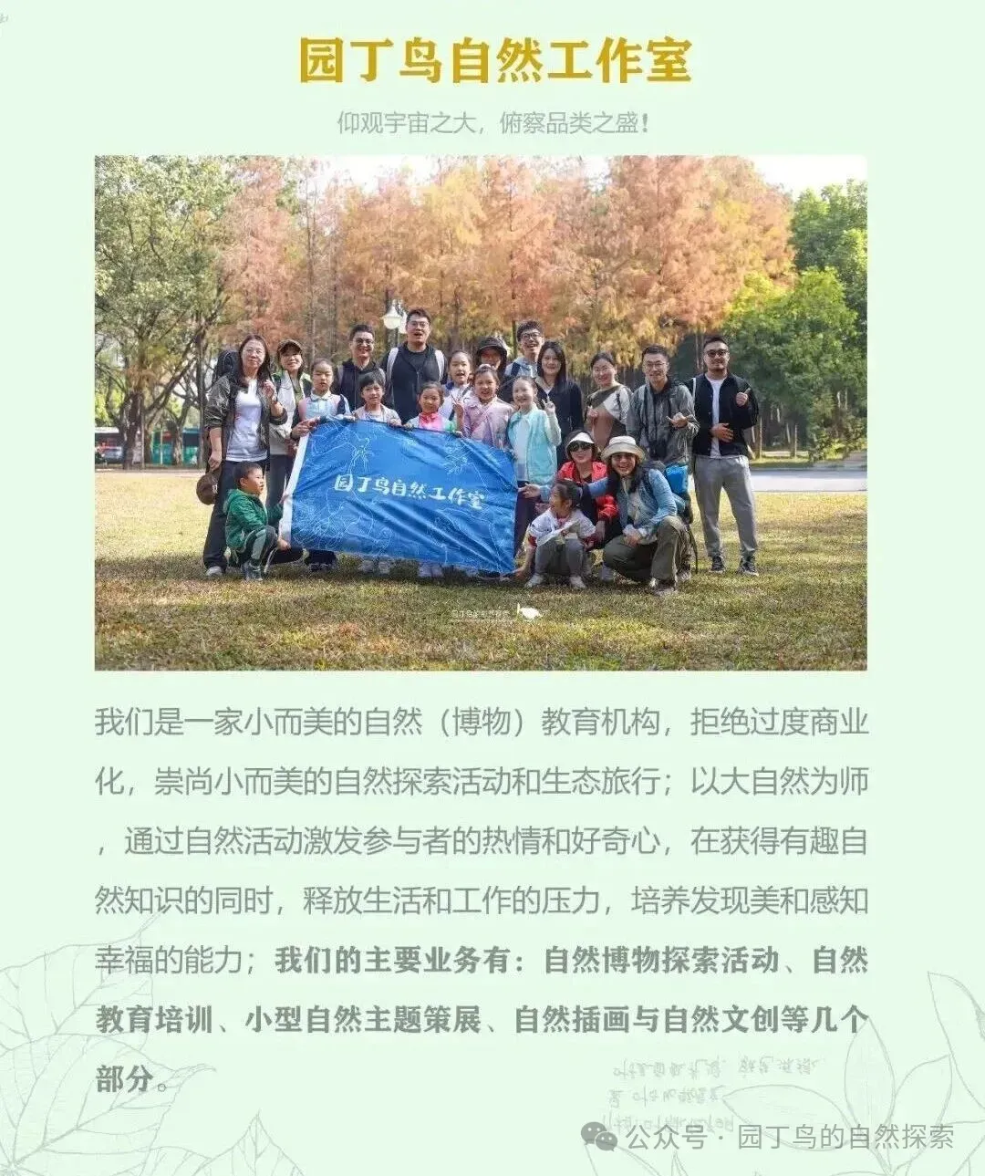 包含:活动设计、策划费,专业自然导师费,场地费,物料费;不含:午餐及交通等个人消费,如需安排,则费用AA或自行选择。
