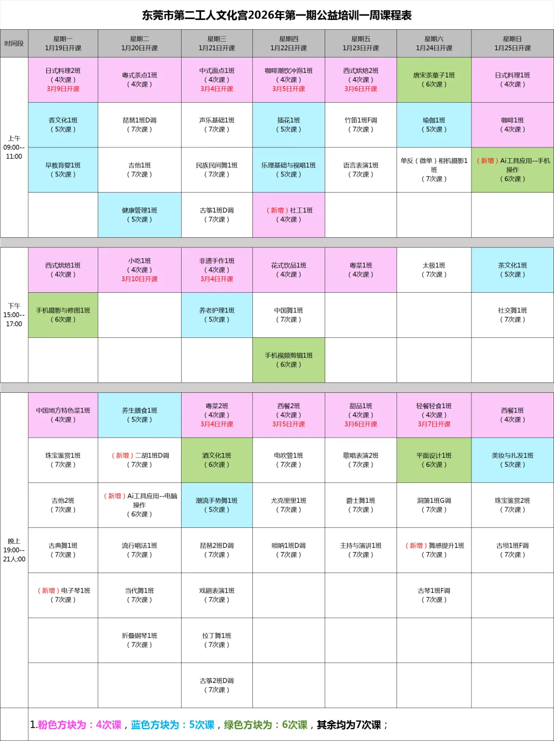 东莞市第二工人文化宫2026年第一期公益培训将开设 语言艺术类 、 综合专业类 、传统民族乐器类 、综合音乐类、舞蹈形体类 、家政类 、餐饮类 、传统文化类 、手作类 ,共计9大类,62种课程项目,71个班级,预计招生1900人。