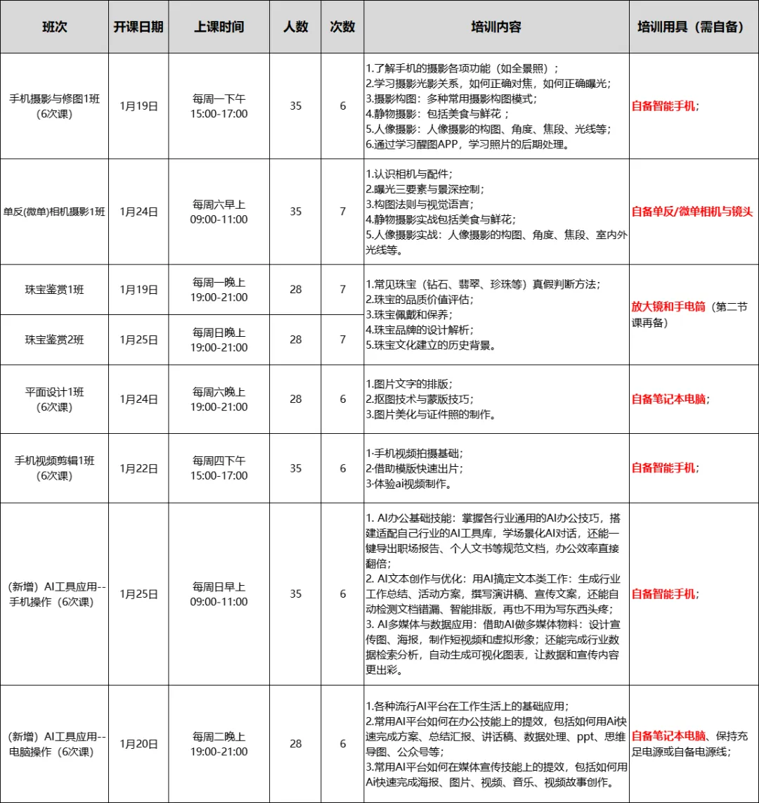 本期新增课程有:电子琴、二胡、AI工具应用(手机操作/电脑操作)、社工、舞感提升。