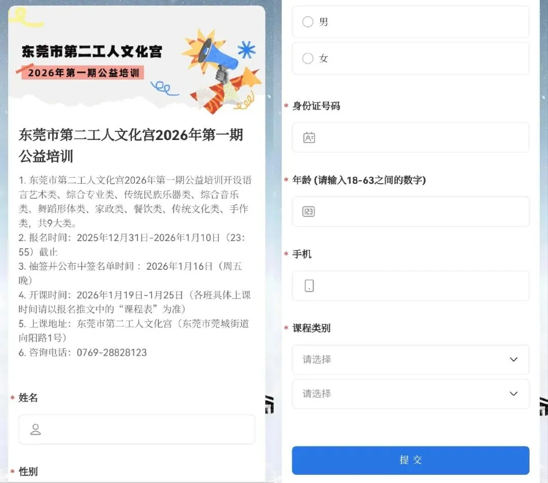 东莞市第二工人文化宫2026年第一期公益培训已经启动报名啦,让职工朋友们在工作之余发现兴趣、提升自我、乐享生活。