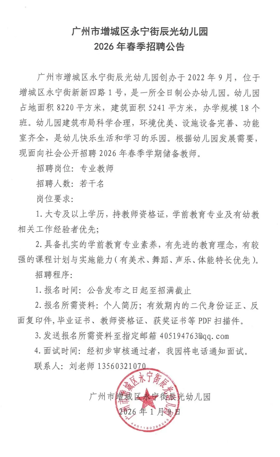 说明:符合要求的报名人员由幼儿园安排进行面试,试用考核合格的按规定签订聘用合同,缴纳五险一金,待遇从优。本招聘公告解释权归广州市白云区永平街中心幼儿园。