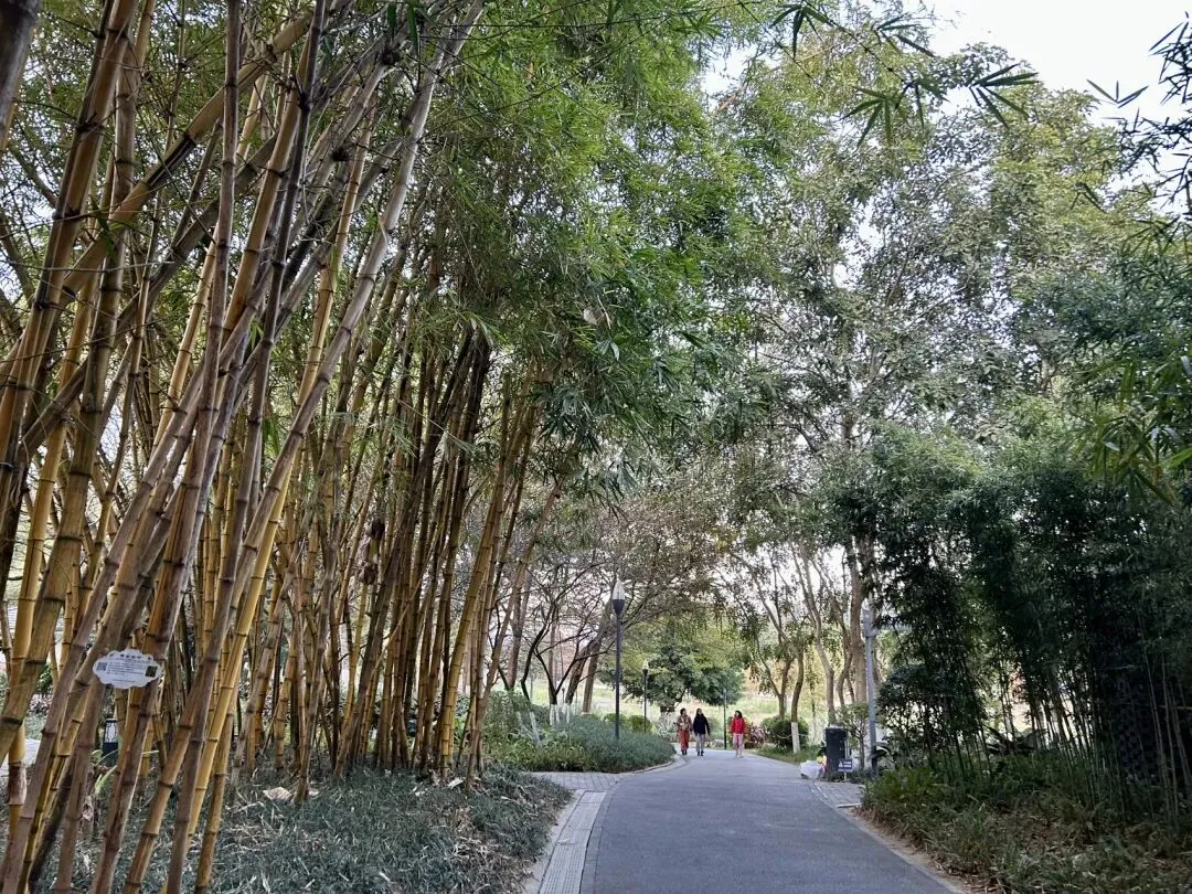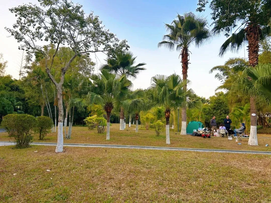 走上坡道当路基与周边公路海拔持平时,便是一片开阔的园林。疏落横斜的竹林围拢出蜿蜒的林荫道,绿地草坪上的椰树和棕榈比比皆是,成为大家露营帐篷的守护神。