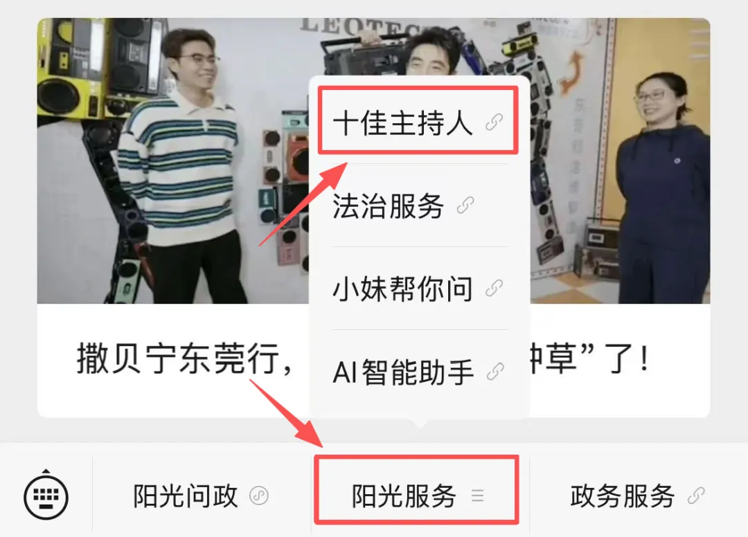 ②在对话框下方的菜单栏选择“阳光服务”,点击“十佳主持人”,进入页面投票。