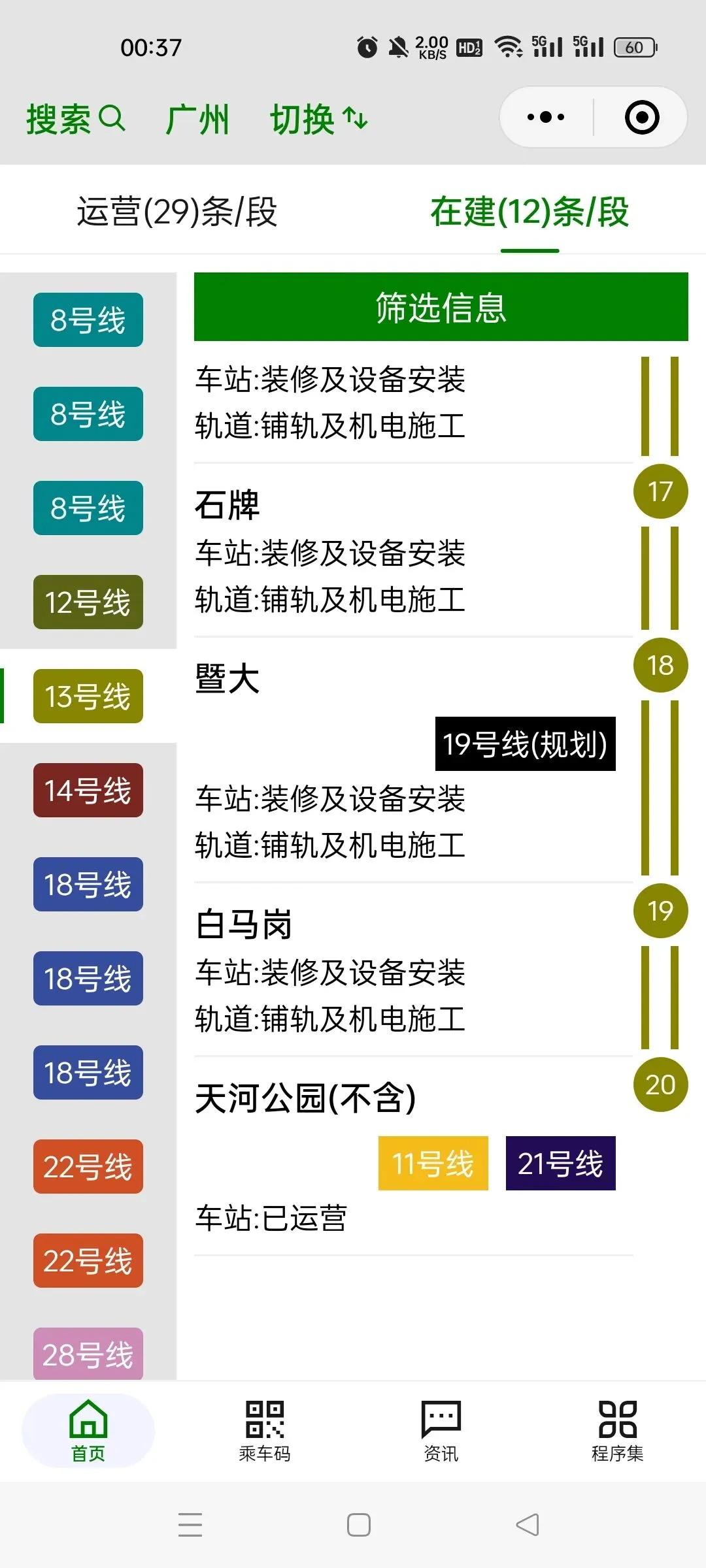 13号线二期(朝阳-天河公园),计划开通时间:2026年。20座地下车站中,1座已开通,17座已封顶,其中17座装修及设备安装,2座土建施工,其中2座主体施工;40个轨行区间中,40个已贯通,其中6个短轨通,34个铺轨及机电施工。凰岗停车场主体施工,出入线铺轨及机电施工。