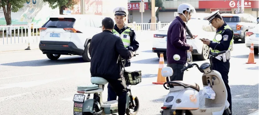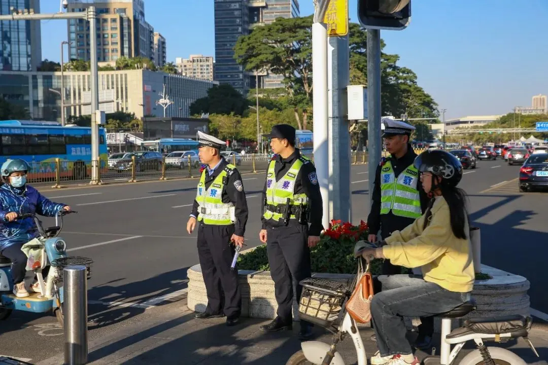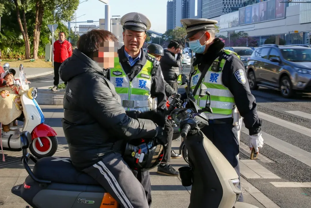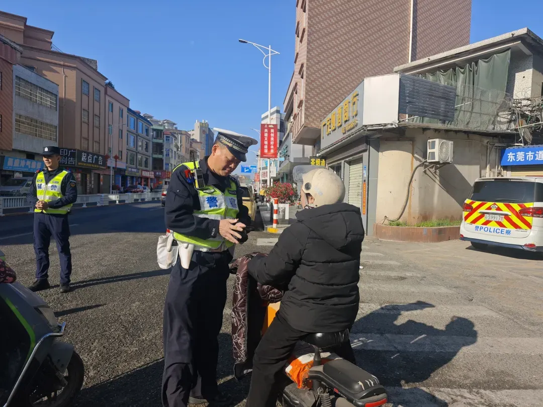 东莞交警莞城大队通过“定点+流动巡逻”相结合,在景区、商圈、农贸市场周边、社区(小区)等重点路段形成密不透风的查处通道,对途经非法加装遮阳篷、无牌上路、不走非机动车道的电动自行车驾驶人进行查处和劝导,坚持教育与处罚并重。