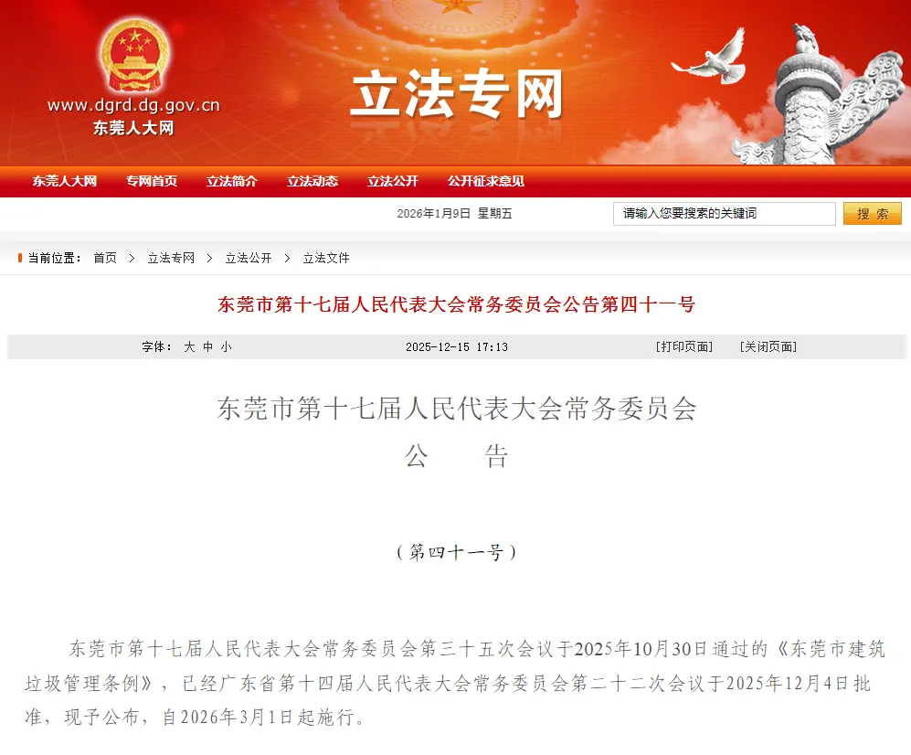 东莞市第十七届人民代表大会常务委员会第三十五次会议于2025年10月30日通过的《东莞市建筑垃圾管理条例》,已经广东省第十四届人民代表大会常务委员会第二十二次会议于2025年12月4日批准,现予公布,自2026年3月1日起施行。