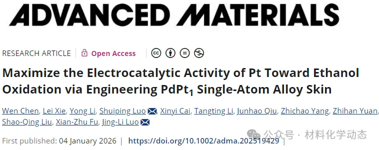 2026年1月4日,深圳大学骆静利、罗水平在国际知名期刊Advanced Materials发表题为《Maximize the Electrocatalytic Activity of Pt Toward Ethanol Oxidation via Engineering PdPt1 Single-Atom Alloy Skin》的研究论文,Wen Chen为论文第一作者,骆静利、罗水平为论文共同通讯作者。