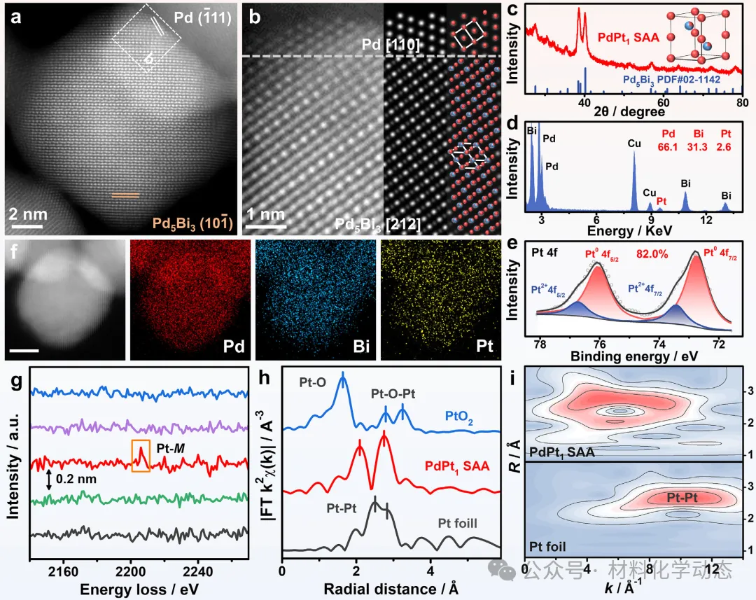 在此,作者报道了一种PtPd1单原子合金表层的合理设计与构筑方法:以PdBi金属间化合物发生相变形成的八面体Pd5Bi3金属间化合物纳米晶为基底,通过具有拉伸应变的钯壳层,将铂活性位点以原子级的方式锚定在基底表面。