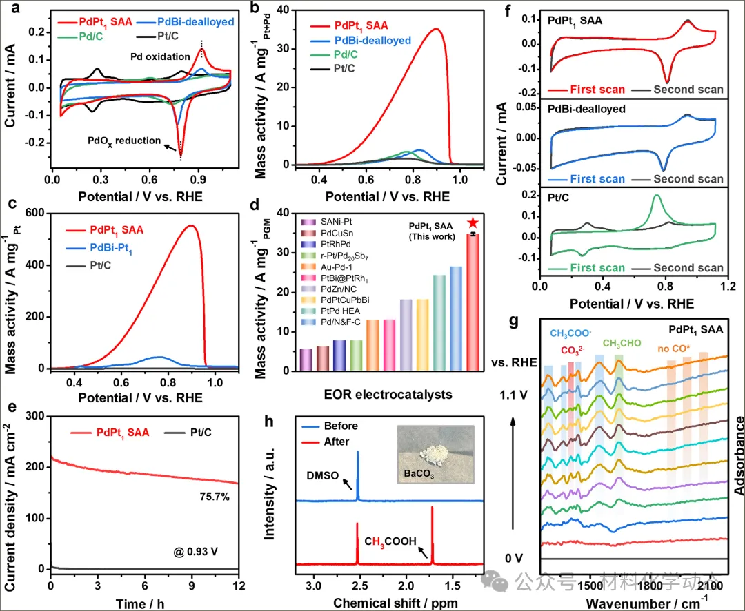 所制备的PtPd1单原子合金表层催化剂,在碱性电解液中展现出优异的乙醇氧化反应催化性能,其峰值质量活性达到34.73 A mg-1(以铂钯总质量计),分别是脱合金化PdBi催化剂、钯碳(Pd/C)催化剂以及铂碳(Pt/C)催化剂的9.1倍、10.1倍和21.3倍。