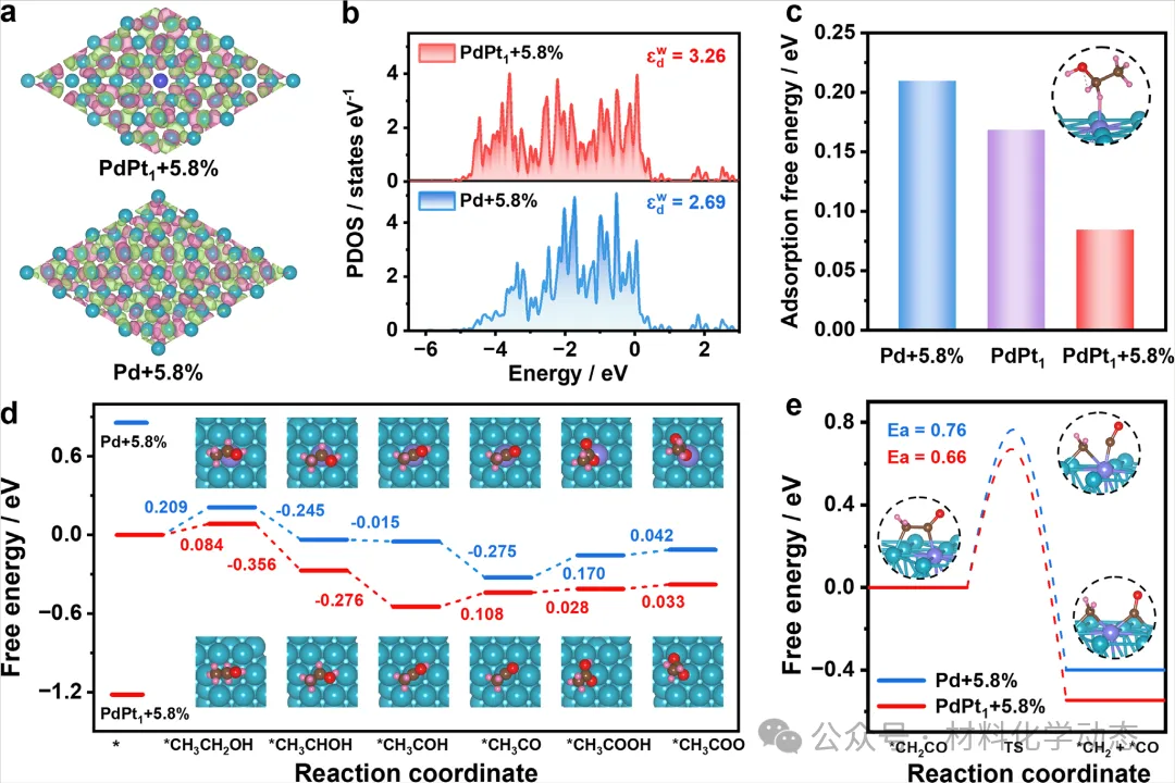 密度泛函理论(DFT)计算结果表明,拉伸应变与单铂原子的协同作用优化了催化剂的电子结构。这种结构调控不仅增强了乙醇分子的吸附与电子转移过程,还降低了反应能垒,加速了碳-碳键的断裂,从而显著提升了乙醇氧化反应的催化性能。