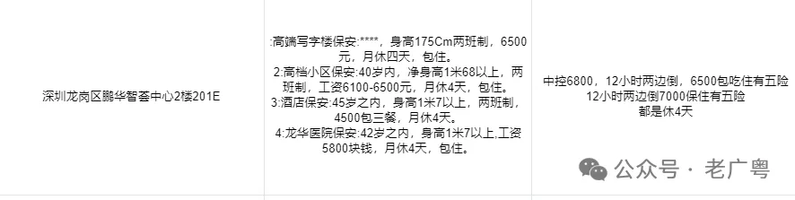 招中级消防设施操作员岗位要求:1、持有消防员中级证书,持电工证优先录用。2、年龄50岁以下、品貌端正、身体健康、责任心强、有团队精神、无不良记录。3、具有消防控制室和维修专业的相关的工作经验。4、工作地址:广州花都福利待遇:1、加班享有加班费。2、购买五险。3、综合工资7000-8500联系电话:15876555866具体电话详谈我司需要持有中级消防证人员5人:1、要求:要求20岁至40岁,男性身高175厘米以上,女性身高162厘米以上,无犯罪前科,无纹身,身体健康;2、工作时间:每天工作十二小时,每月休息四天;3、薪资待遇:月薪7500元,包住不包吃,购买五险;4、工作地点:深圳市宝安区沙井街道原先生13691770834消防中控室监控员岗位要求必须持有消防中级证书身体健康,女性40岁以内12小时工作制薪资待遇月薪7K,包食住,有社保,月休4天地址:陈村佛陈路金锠花园联系人:刘小姐13316302960招聘2名消控岗安保,7000一个月休息3天,包住不包吃。要求有证,身高175cm 40岁以下,不戴眼镜。纯中控不需要巡逻打点,但是要看好视频监控那点事,比如领导去向等等。 上班地址:粤海门地铁站附近某大厦 加微信面试:momo457291因为一个住宅项目需要,需要招聘10位维保人员,维保地点在全广州(单位在广州黄埔区),需要有中级维保证,起薪6000元/月,有经验则再往上加薪,有电工证优先有兴趣的朋友请加 黄先生 微信 16624793373,并提供简历招持中级监控证中控员1名,年龄45岁以下,身高1米68以上。包住不包吃,月工资6700,月休4天,两班倒制,无犯罪记录,工作地点:东莞大岭山联系人:何队电话18675503069物业项目招聘保安员(非中介公司直聘)一、监控操作员4名(男女不限)1、要求:18-40岁以下,身高173以上,有中级消防证,能独立操作消防设备,身体健康,无犯罪记录。2、薪资待遇:7000元/月,月休4天上班时间:12小时,两班倒上班地点:南山御成府有意向请联系:宋明江13418853046(微信同号)中控岗税前工资(7500-8000)6、所有岗位包住不包吃(有餐补)岗位要求1、身体健康,身高175以上、20-35岁、不戴眼镜2、品行良好、无犯罪记录、无纹身、高中以上学历对消防安全检查、及时排除安全隐患中控岗位要求必须有消防设施操作员证18577167938招聘小区消防中控1、工作内容:负责中控室工作,不巡逻不打点。2、职位要求:持证上岗,无不良嗜好,年龄18-45周岁3、薪资待遇:工资6000,月休四天,包吃住。联系人:苏队电话:13182920615工作地址:广州黄浦区康大祥文府罗湖梧桐山地铁站附近招聘中级消防证1名,身高170以上,年龄45岁以内,有工作经验。服从管理,要开无犯罪记录证明,三甲以上医院体检报告,服装发放,自备黑色皮鞋,12小时工作,月休四天,包吃住,试用期一个月工资6500,转正之后7000元,工作轻松,环境好。吧连队,17318022689招聘中级消防员22名上班地址:深圳南山区西丽万科云城万科两班制(12小时,双人岗,纯中控),月休4天,22岁-35岁年龄左右,身高170以上。(有中级消防证)1、不买社保 综合工资6800+500(房补)+200元(绩效)=7500元。2、买社保综合工资6500元,没有其他13510296027年龄48岁以下:有中级证:身体健康:包吃住6000:每个星期休息一天:(休息四天)联系电话15602828435工资7300,两班倒12小时制,月休4天,包住不包吃,需持中级消防证,提供三甲医院体检报告18718519086需要了解更多优质岗位加微信199246563131.切记:黑字岗位不收取任何费用!内推岗位联系方式默认为作者,请联系作者咨询。