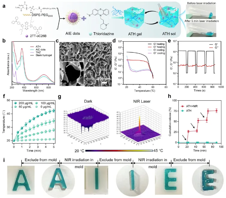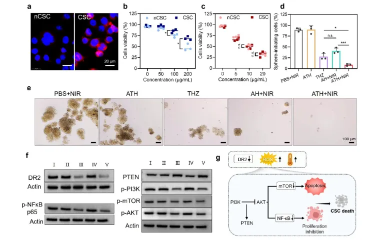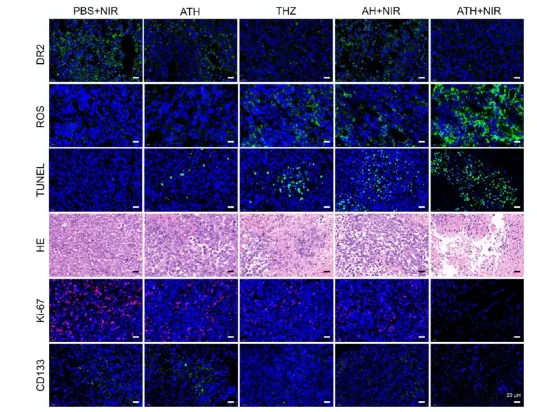 接下来,对肿瘤组织的病理切片进行了苏木精和伊红 (H&E) 染色以及各种免疫组织化学分析。H&E染色描绘了ATH+NIR组大多数肿瘤细胞出现了组织病理学改变和坏死(图5)。TUNEL和Ki67染色说明了远隔肿瘤的破坏和癌细胞增殖的抑制。CD133染色代表了CSCs的活力。在ATH+NIR组中观察到CD133的荧光信号减弱,证明CSCs被有效杀死。此外,免疫荧光染色和WB测试共同证明了对DR2、PI3K/Akt/NFkB 和 PI3K/Akt/mTOR通路的抑制。因此,可以安全地提出ATH凝胶优异的体内外抗肿瘤和抗CSC能力的机制:首先,激光照射刺激来自AIEgen的光热效应,这溶解了水凝胶并原位释放了硫利达嗪。硫利达嗪作为多巴胺受体阻滞剂,通过同时抑制PI3K/Akt/NFkB和PI3K/Akt/mTOR 通路成功诱导了氧化应激和内质网应激,这增强了溶酶体靶向AIE点的PTT效应。这表明ATH显示出PTT和化疗的最佳协同效应,以实现高效的抗肿瘤行为和复发抑制。