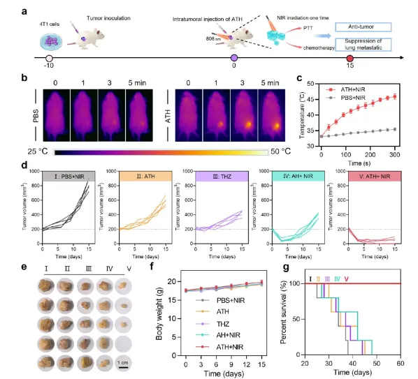 为进一步评估NIR激光可激活ATH的治疗效果,根据五个组对4T1荷瘤小鼠进行瘤内注射不同制剂,每组包含5只小鼠:PBS、ATH、THZ、AH+NIR和ATH+NIR。AH+NIR和ATH+NIR组的小鼠用808nm激光以1W/cm² 照射5分钟。在治疗期间监测体重和肿瘤体积(图4a)。他们首先研究了体内激光触发的ATH离子热疗。红外热图像显示,与PBS处理(35.5℃)相比,注射ATH的小鼠在连续激光照射5分钟后温度升高至47℃(图4b,c)。AIE纳米颗粒优异的温和PTT可以触发有效的THZ释放(高于30℃)。为了评估药物动力学,进行了NIR荧光成像。用ATH和NIR照射治疗的小鼠显示出显著的肿瘤抑制。仅使用THZ或AH+NIR的单一疗法在最初的3天内也显示出肿瘤生长抑制。然而,肿瘤随后重新生长。这种复发可能源于THZ的耗尽以及在长期肿瘤生长过程中原位PTT的持续时间有限。同时,ATH或PBS治疗显示出指数级肿瘤生长(图4d)。光学肿瘤照片显示,ATH结合激光照射治疗导致肿瘤尺寸最小化,一些肿瘤完全消失,这与该治疗组最低的肿瘤重量一致(图4e,f)。ATH+NIR治疗的小鼠在60天时显示出延长的存活率(100%),这显著长于PBS (38天)、ATH (45天)、THZ (44天)和AH+NIR (48天) 组。