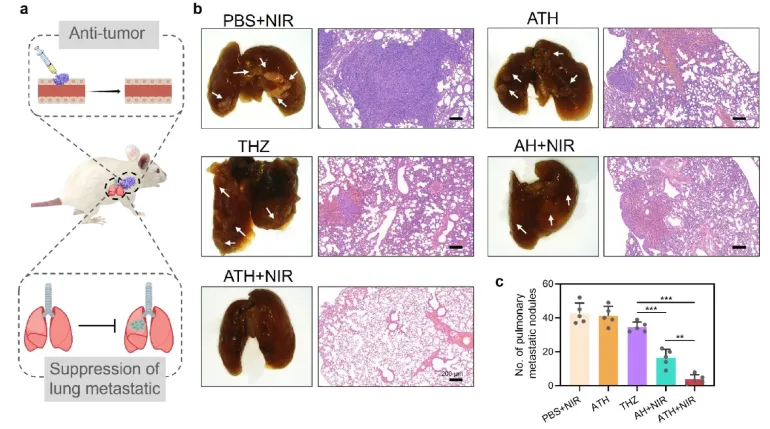相反,由于癌症干细胞的存在,乳腺癌极易产生耐药性并转移至肺部。受ATH水凝胶在抑制肿瘤复发和刺激抗肿瘤免疫反应方面优异表现的鼓舞,他们进一步评估了其对小鼠长期转移抑制的影响(图6a)。如图6b,c 所示,来自PBS+NIR组的肺组织显示出明显的肿瘤结节(白色箭头),而来自ATH+NIR组的肺组织保持健康,未发现任何转移结节。同样H&E染色证实ATH+NIR治疗有效抑制了肿瘤转移和复发。定量结节结果进一步验证了这些结果,证明了ATH水凝胶中AIE光热剂和硫利达嗪的持续和激光触发释放提供了对残留4T1肿瘤细胞向肺部迁移的长期预防。为了评估长期抗肿瘤免疫的效果,他们研究了肺转移模型中不同治疗小鼠收集的血液样本中记忆T细胞 (CD3+CD8+CD62L+CD44+)的频率。ATH+NIR组中记忆T细胞的比例显著增加,高于AH+NIR和THZ组中观察到的比例。这暗示ATH+NIR治疗产生的功能性记忆T细胞可能有益于刺激抗肿瘤免疫反应。为了评估治疗的生物安全性,对主要器官进行了苏木精和伊红(H&E)染色。在ATH+NIR治疗后,心脏、肝脏、脾脏、肺和肾脏中未观察到明显的病理异常或炎症细胞,这与PBS组一致。常规血液和生化测试显示ATH+NIR和PBS组之间没有显著差异。总的来说,生物相容性评估表明,他们的水凝胶纳米复合材料中的THZ和AIE点在光疗和化疗中不会引起全身不良反应。