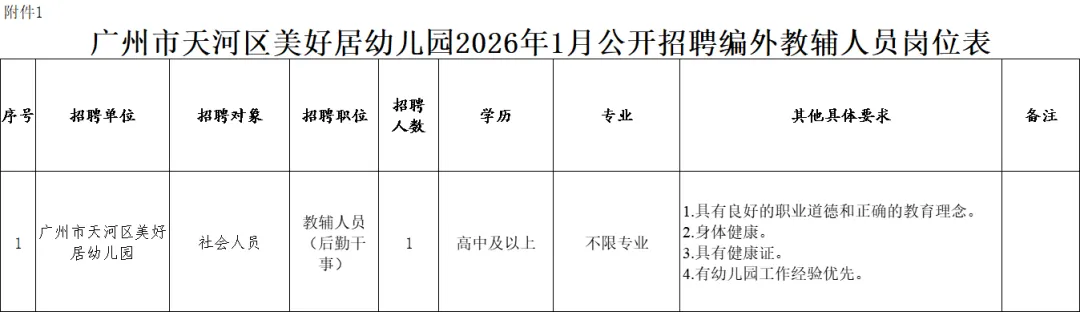1. 广州市天河区美好居幼儿园2026年1月编外聘用制专任教师职位表