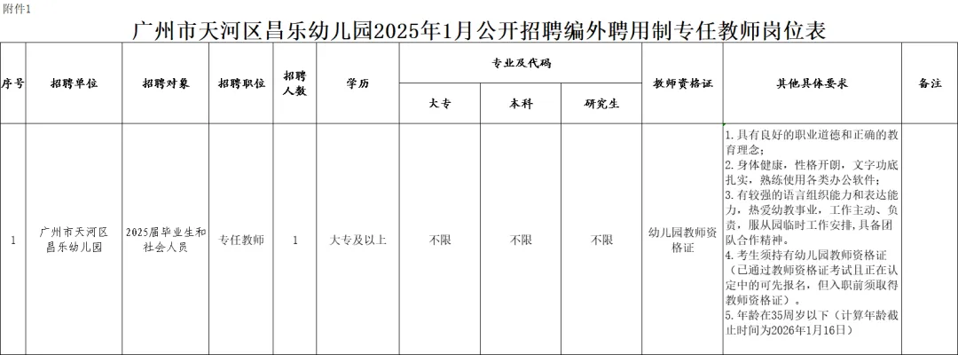 - 广州市天河区昌乐幼儿园2026年1月公开招聘编外聘用制专任教师岗位表