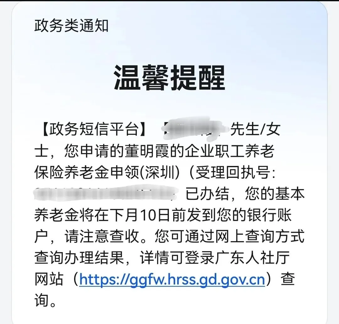 因为退休审核在办理成功后,社保局会发一条温馨提示信息,这条已经说明退休审核已办结,只静待领取养老金了,同时职工电子退休证也可以领取。如下图所示: