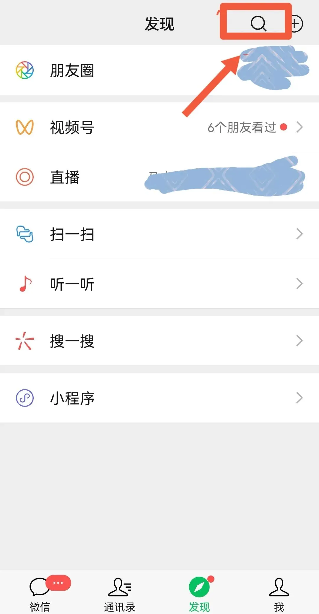 第二步:进入“发现”页面后——再点击“搜索放大镜”,如下图所示: