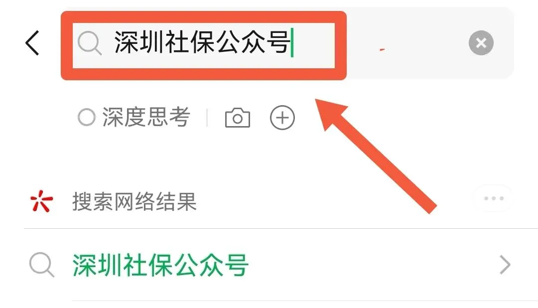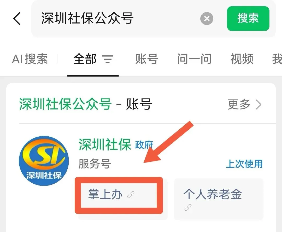 第三步:在搜索栏输入【深圳社保公众号】——再点击右手边最下面输入栏的“蓝色字【搜索】——进入“深圳社保公众号”页面点结【掌上办】进入。如下图红色标注所示: