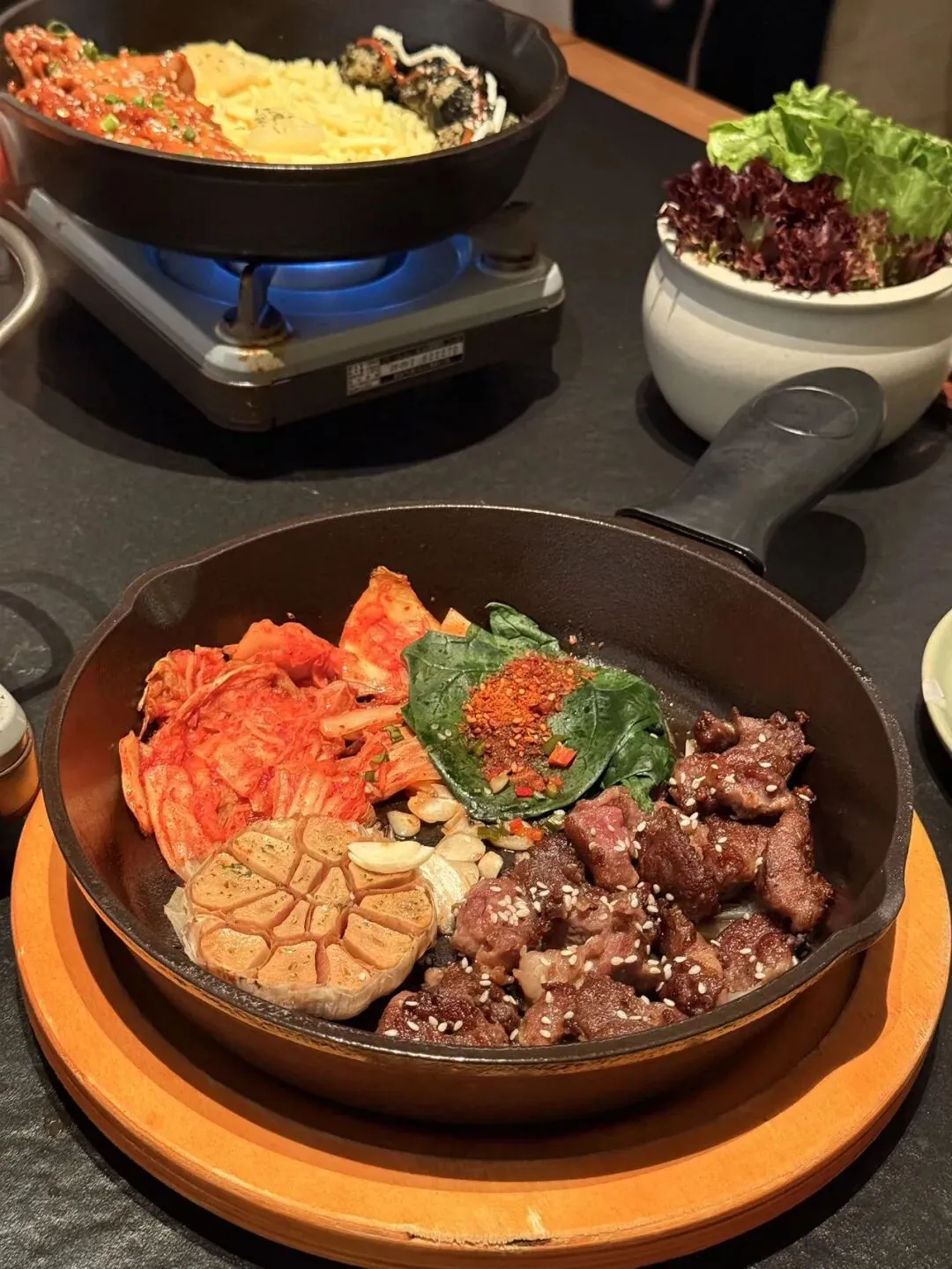 味道还不错,包上菜叶➕辣白菜➕🧄🟰舌尖上的美味;烤熟的大蒜别有一番风味,软糯好吃;牛肉蘸上调料也很美味😋