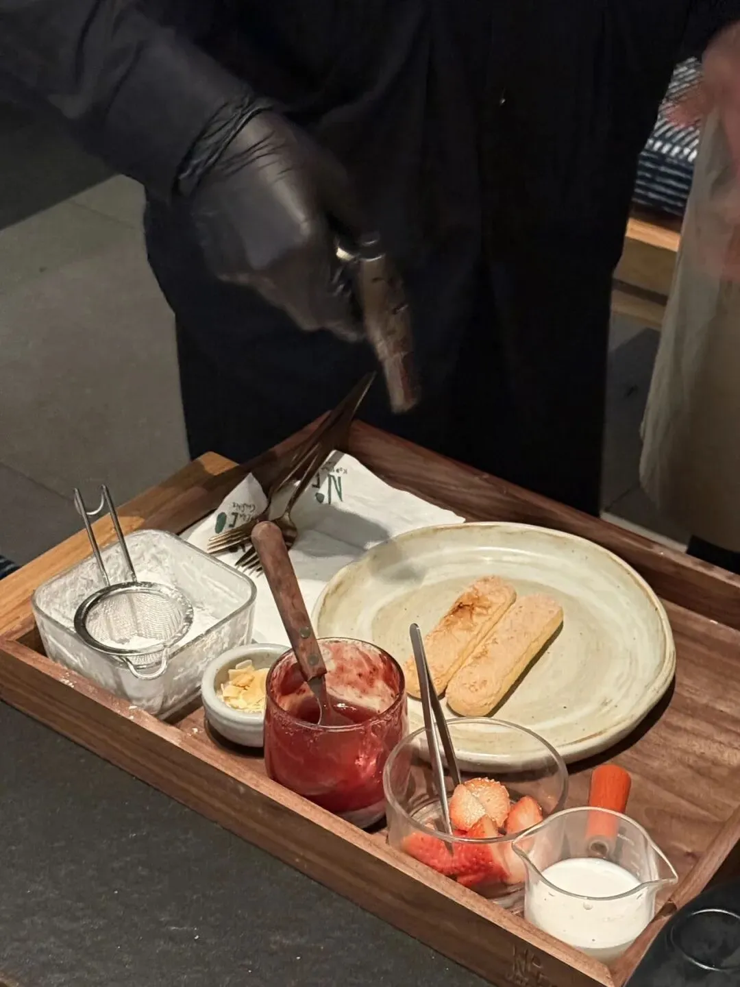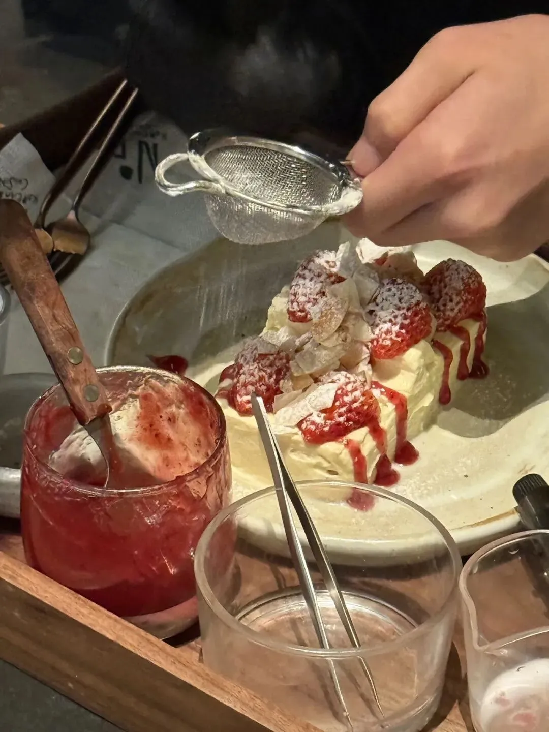工作人员会根据你的需求,将材料拿过来为你亲手制作。拇指饼干是服务员用火枪现烤的,吃起来会带着酥香味;草莓正值季节,吃起来甜中带着一点酸恰巧中和奶油的一点点甜味。很值得爱吃甜品的美眉入手。(ps:做完了一定要赶紧吃掉)