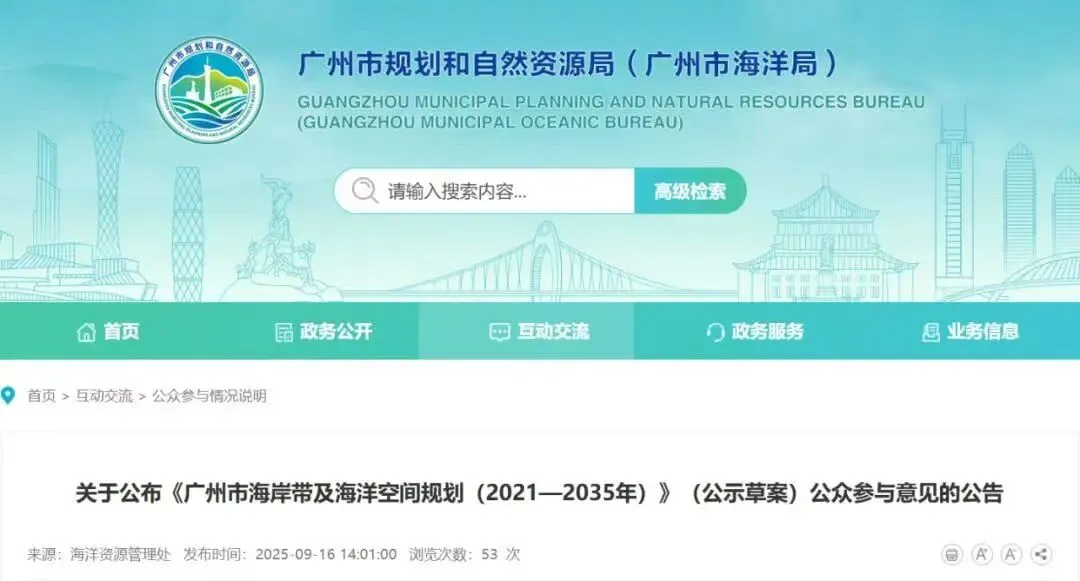 2025年8月11日至9月11日,《广州市海岸带及海洋空间规划(2021—2035年)》(公示草案)通过网站留言、邮件等渠道公开征求意见,该处公布了采纳的3条意见。