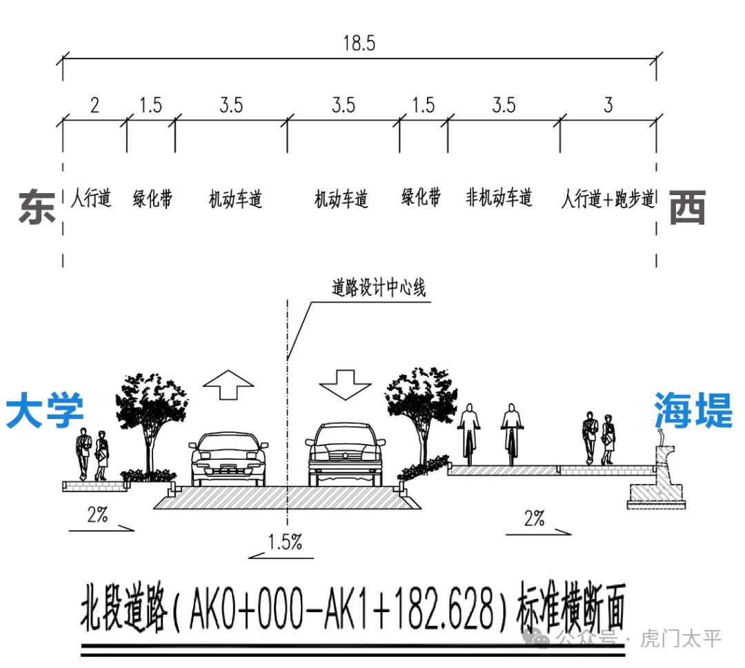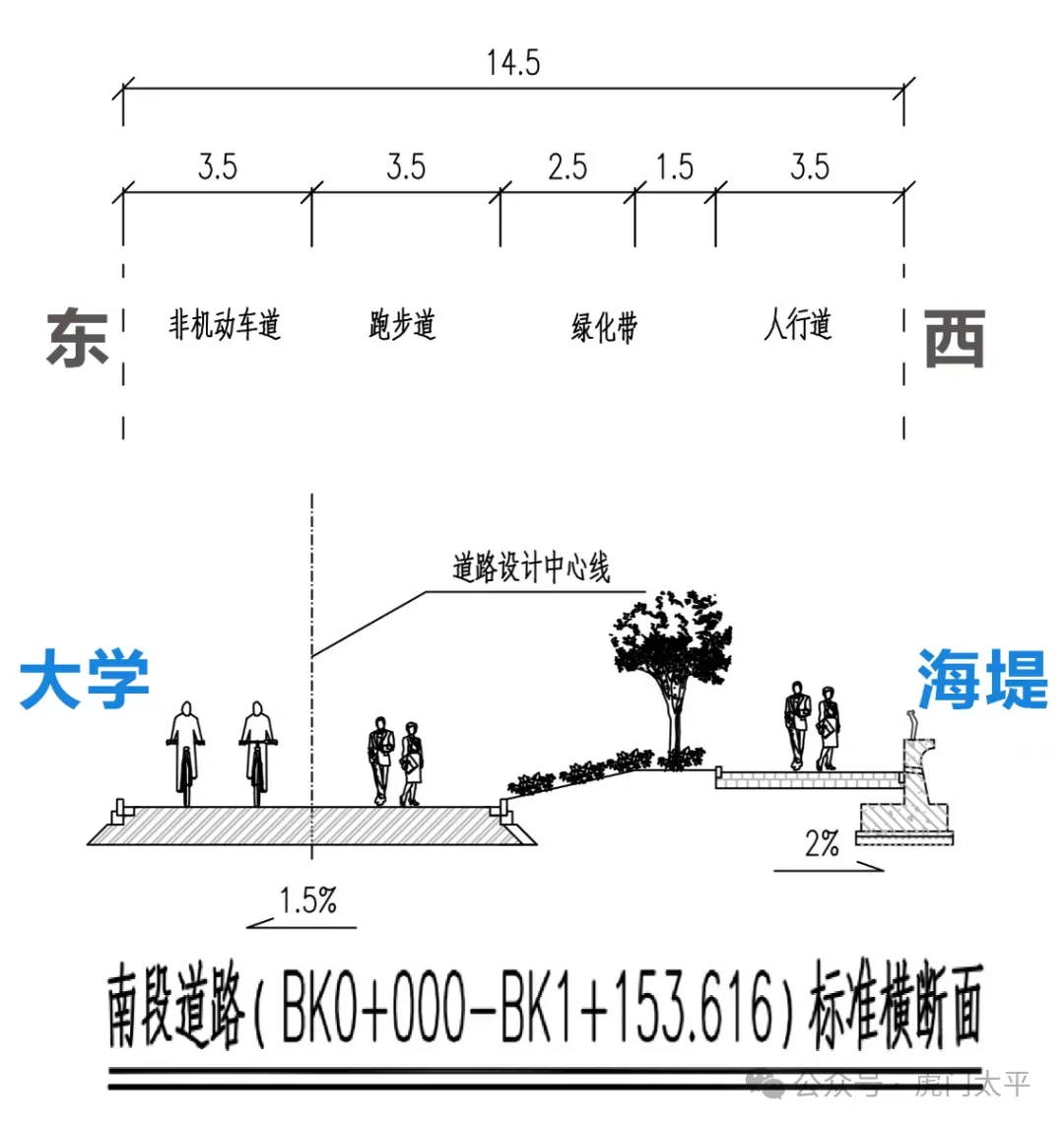 大湾区大学海堤堤顶路分为两段建设,北段(约1162米)建设非机动车道、人行道、跑步道以及双向2车道,南段(约1160米)建设非机动车道、人行道、跑步道,预留未来改建双向2车道的空间。