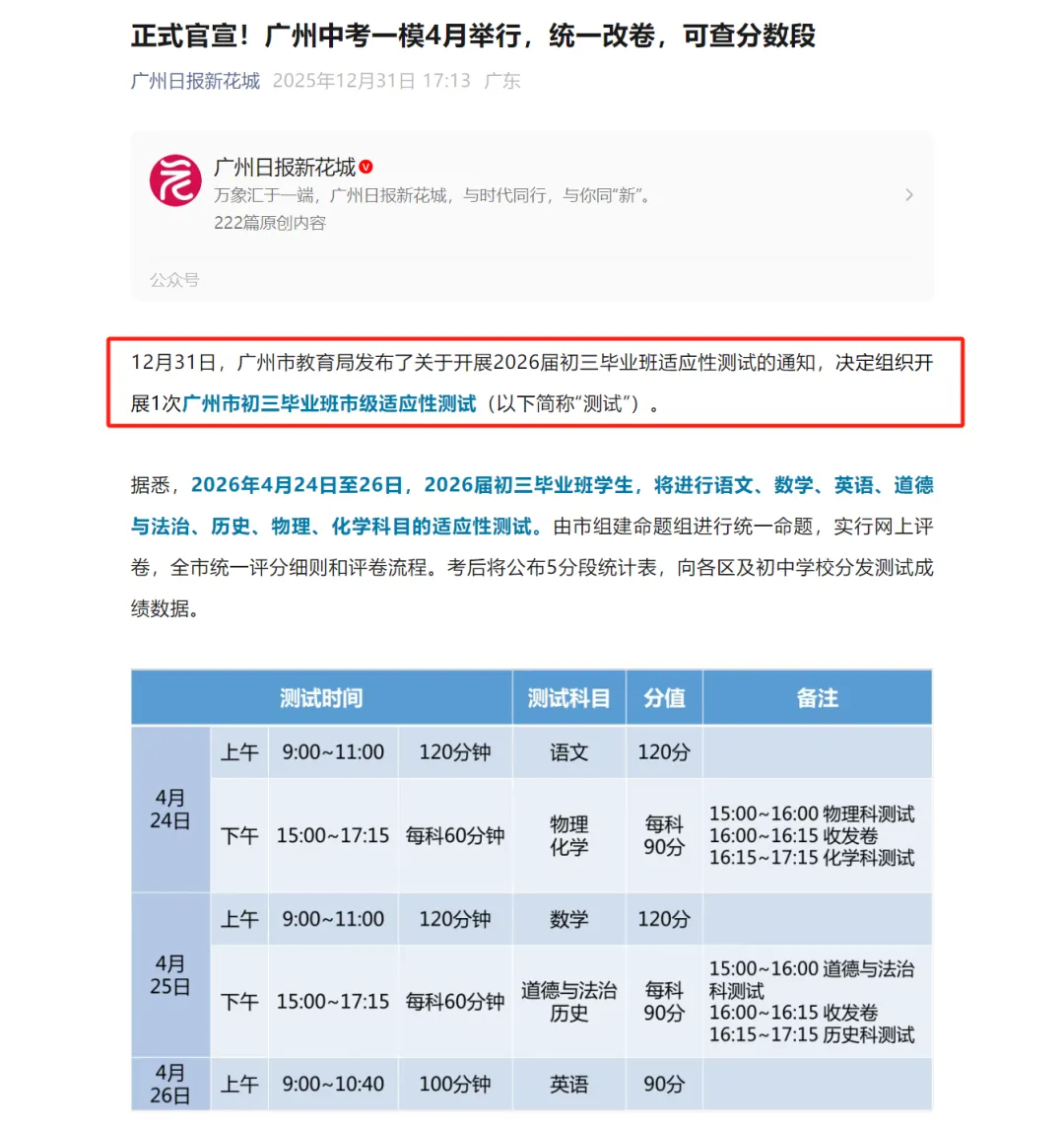 2026届广州中考考生与家长注意了!广州市教育局近日正式发布通知,将组织全市初三毕业班进行市级适应性测试(即常说的“中考一模”),时间为2026年4月24日至26日,涵盖语文、数学、英语等七科。本次测试由市统一命题、统一评卷,考后还将公布5分段统计表,帮助考生了解自身在全市的大致位置。
