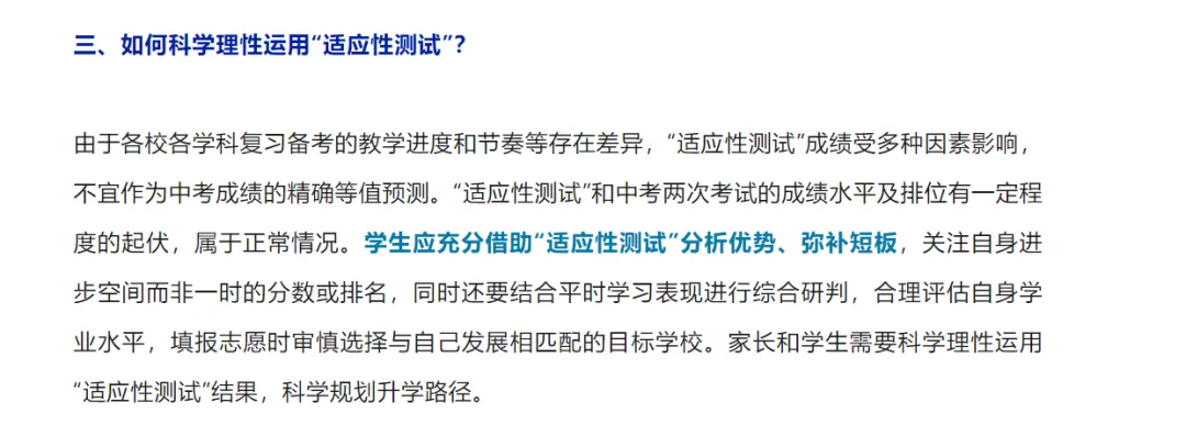 市教育局明确,本次测试旨在服务升学备考、减轻不必要负担,帮助学生适应中考的时间节奏、试卷结构与题型题量。测试成绩可作为学情诊断与复习调整的参考,但并非中考成绩的精确预测。