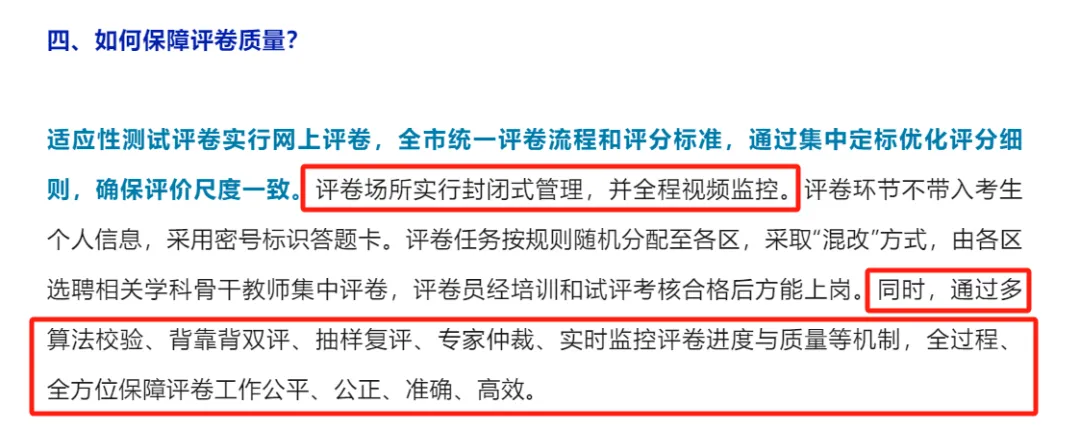 本次测试采取封闭式网上评卷,全程视频监控,评卷员经培训考核后上岗。通过“双评”“仲裁”“多算法校验”等机制,确保评卷过程公正、准确。