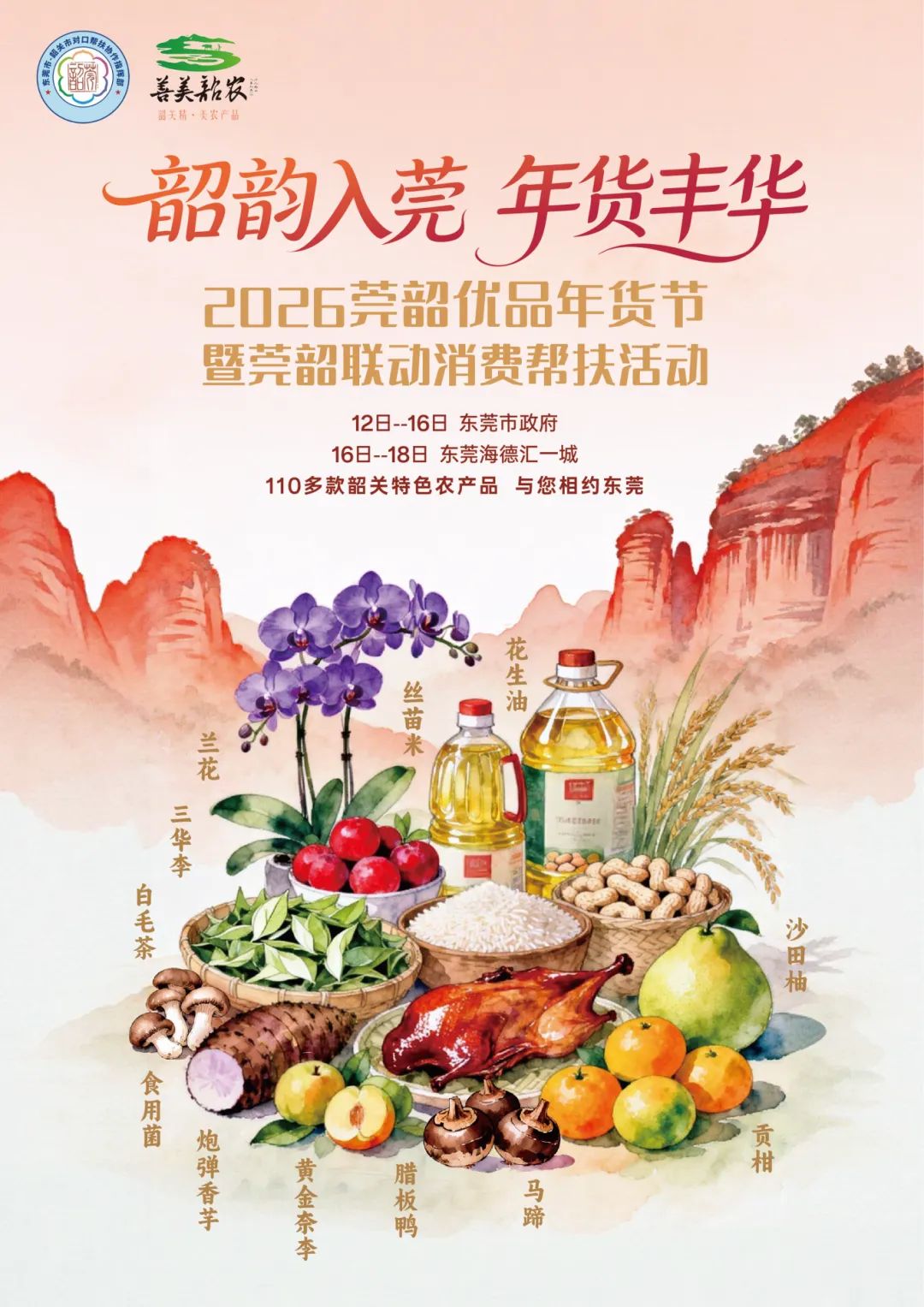 为深入贯彻中央一号文件精神,全面践行党的二十届历次全会精神,大力推进“百千万工程”落地见效,进一步落实《农业农村部促进农产品消费实施方案》,积极开展“品特产 寻年味”活动,加快“12221”农产品市场体系建设,展示莞韶两地对口帮扶协作成果,根据莞韶两地联席会议工作要求,由东莞市-韶关市对口帮扶协作指挥部,韶关市农业农村局主办,东莞市人民政府经济协作办公室,东莞市机关事务管理局协办的“韶韵入莞·年货丰华”2026莞韶优品年货节暨莞韶联动消费帮扶活动即将重磅启幕!