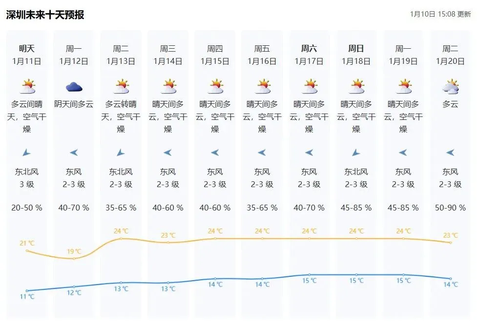 深圳气象局表示,近期虽有冷空气影响,但是5天的平均气温还是13.5℃,尚未达到入冬标准,且深圳并非每年都会入冬,入冬概率在50%左右;国家标准滑动5天的平均气温低于10℃即入冬,10℃那天即为入冬日。