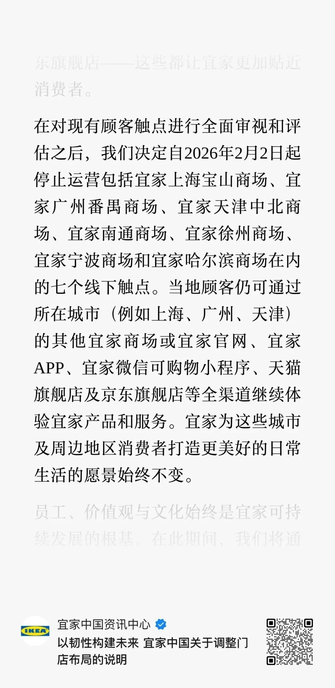 家人们,重磅消息来啦😮!宜家广州番禺商场要和各位街坊“挥手告别”咯!宜家中国资讯中心发布了关于调整门店布局的说明。里面明确提到,从2026年2月2日起,宜家将停止运营7家商场,咱们熟悉的宜家广州番禺商场赫然在列。这一调整过后,宜家在广州就只剩下天河美林天地商场这一家门店啦。曾经,番禺商场是不少街坊周末休闲、采购家居好物的好去处,如今却要关闭,实在让人有些感慨。对于这件事,大家都有啥想法呢?欢迎在评论区留言讨论~