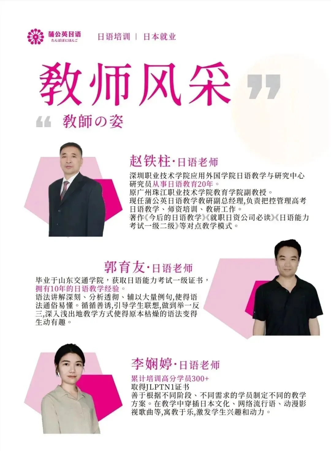 蒲公英日语的授课教师均持有日语N1顶级证书,平均教学经验超8年,深谙中日双语教学逻辑。无论是为零基础学员搭建扎实的日语知识框架,还是为中高级学员提供针对性的实战提升训练,老师们都游刃有余。