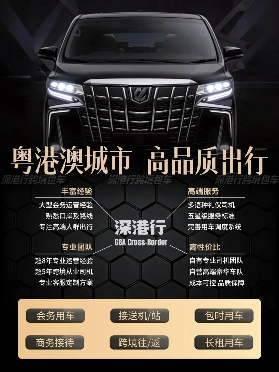 核心优势:两地牌埃尔法商务车,合法跨境通行,深圳湾口岸随车通道5 分钟丝滑通关,乘客无需下车,真正实现 “门到门” 服务
