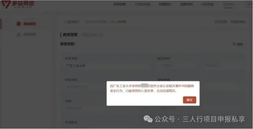 1月7日,有广东工业大学应届毕业生发帖称,她向广州多益网络股份有限公司(下称“多益网络”)招聘官网投递简历,在“教育背景”一栏填写毕业学校时,却弹出提示,称“因广东工业大学老师罗某某在软件企业认定相关事件中的颠倒是非行为,已被系统列入黑名单,无法投递简历。”