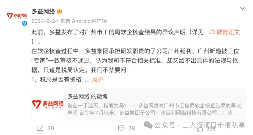 2024年9月,多益网络在其官方微博发布《谁在一手遮天、指鹿为马?——多益网络对广州市工信局软企核查结果的异议声明》,激烈质疑评审过程。
