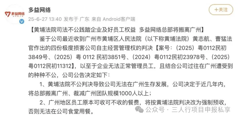 2024年,多益在成都因为员工劳动仲裁输了官司后,一气之下决定在最迟3年内,关闭在成都的所有相关公司。现在轮到广州了,我们来看看多益微博吧。