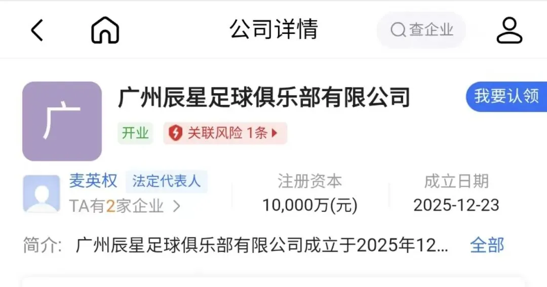 有点好奇这是一间怎样的足球俱乐部?一个亿的注册资本,感觉有些不简单...而注册时间是去年年底...